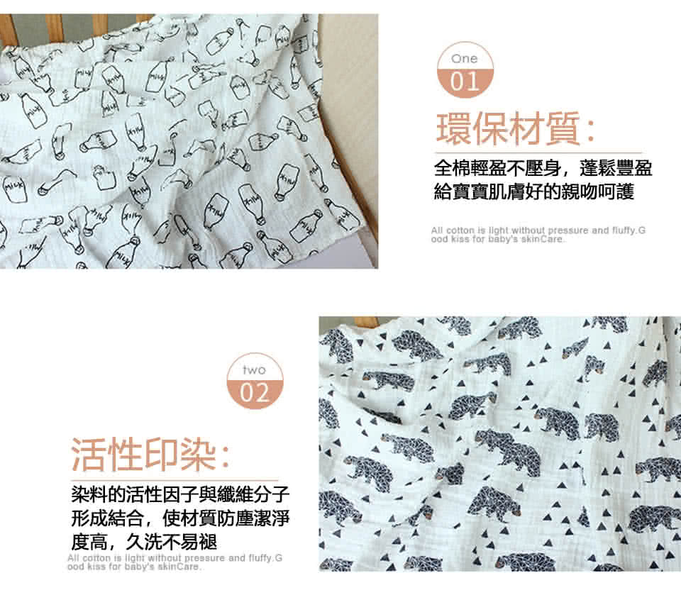 使用100%棉並配合活性環保印染,安全不含螢光劑最適合寶寶嬌嫩肌膚